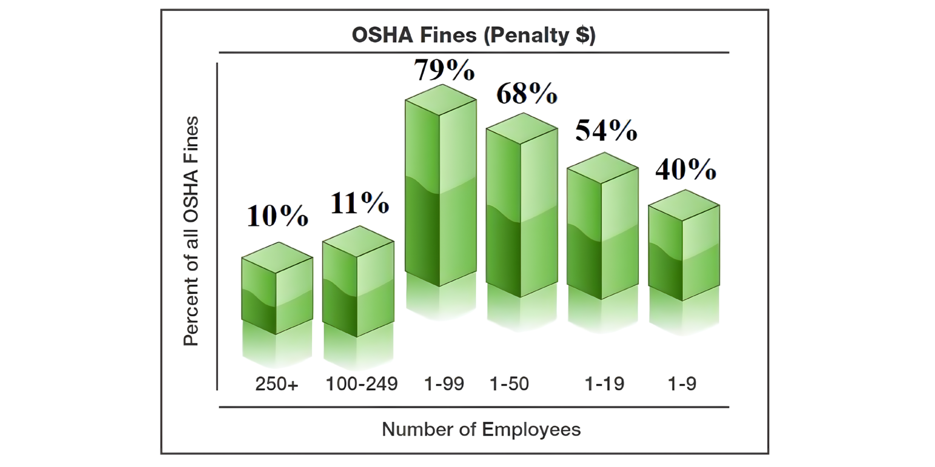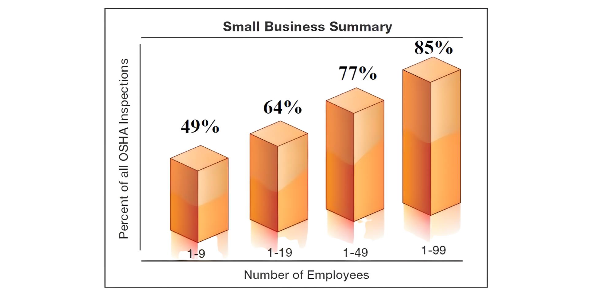 Smaller companies are inspected and fined more frequently than larger companies a statistical fact shown by OSHA data. According to the chart, 49% of all OSHA inspections involve businesses with 1–9 employees, 64% for 1–19, 77% for 1–49, and 85% for 1–99 employees. This means that the smaller your company, the more likely you are to be inspected.