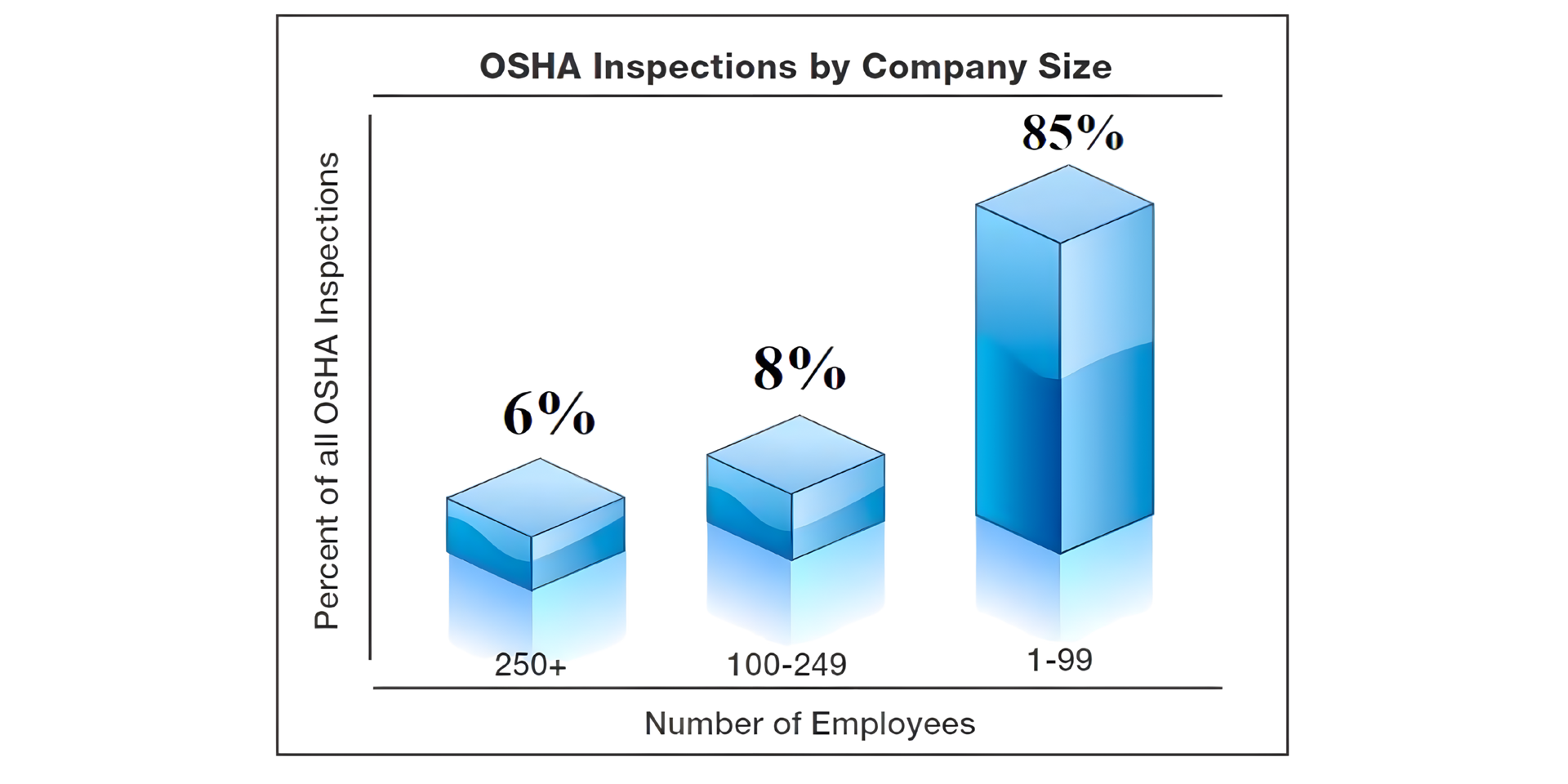 Data shows that 85% of all OSHA inspections involve companies with fewer than 100 employees, while only 8% involve firms with 100–249 employees, and just 6% involve large corporations with 250+ employees.